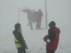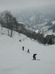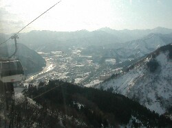 GALAのゲレンデに行くゴンドラから。 湯沢の街と周囲に広がる山並み。きれいですね。 こりゃ〜天気が良さそうだ、そう思ったんだけどね。 |