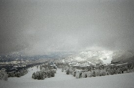山頂近く、ユートピアゲレンデからの眺め。 下に広がるのはゲレンデ&山形盆地です。 ゲレンデの中には三角屋根の”とどまつヒュッテ”が見えます。 |