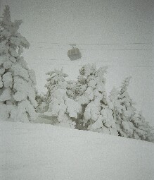 雪と氷に包まれたトドマツの間から、今シーズンから導入の新型ゴンドラが見えました。 16人乗りですが、めちゃ速!!感動です!! トドマツが樹氷の正体なのですが、二月末の晴天で雪が融けてしまったそうで、枝葉が見えてしまっています。 |